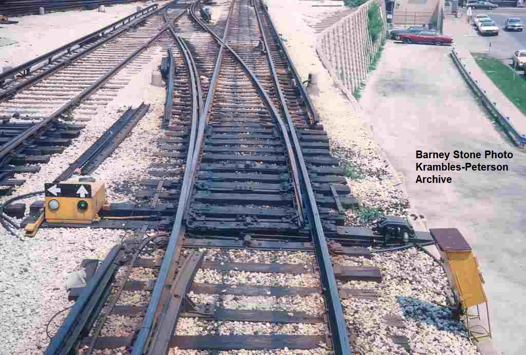 KP1705-CTA Lake-Dan Ryan, Looking east from Marengo at the yard signage and crossover (switch lined for a diverging move) - c06/1978