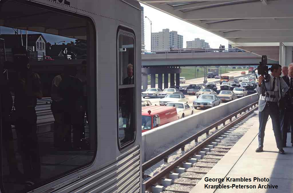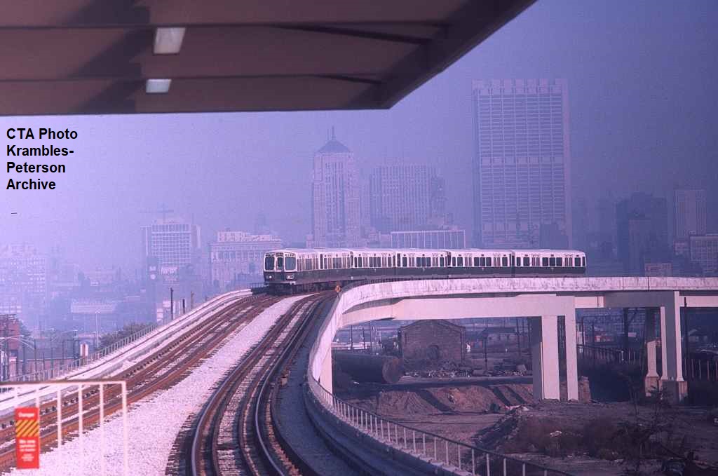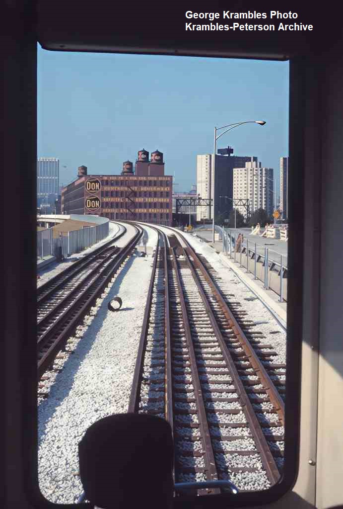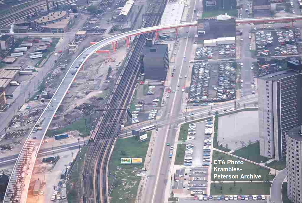 KP1720-CTA Lake-Dan Ryan, Looking Northeast across the 18th & State Junction and connecting structure/tracks on opening day of Dan Ryan Service - 09/28/1969