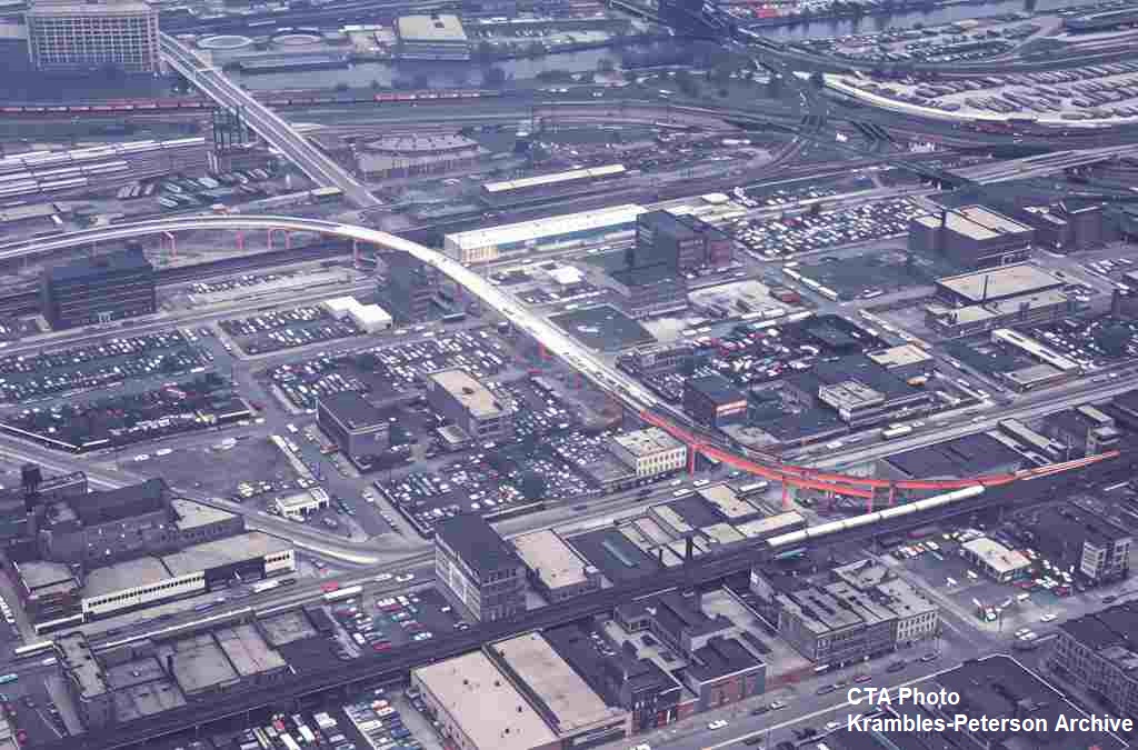KP1717-CTA Lake-Dan Ryan, Aerial photo looking northwest over the structure centering at Clark & 18th - 06/03/1969