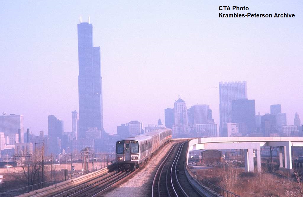 KP1728-CTA Lake-Dan Ryan, a southbound train of 2000s in the platinum paint scheme approaching Cermak with the Sears Tower in the background - c03/197