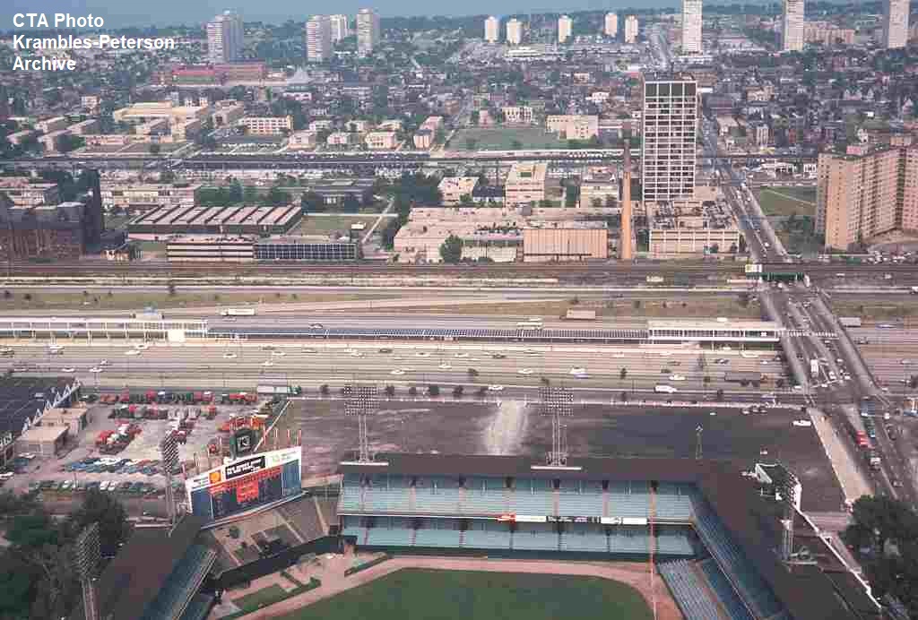 KP1744-CTA Lake-Dan Ryan, Aerial view looking east at the 35th Street Station with Comiskey Park also in view - 07/10/1970