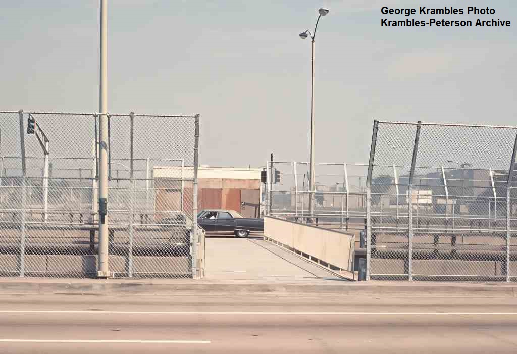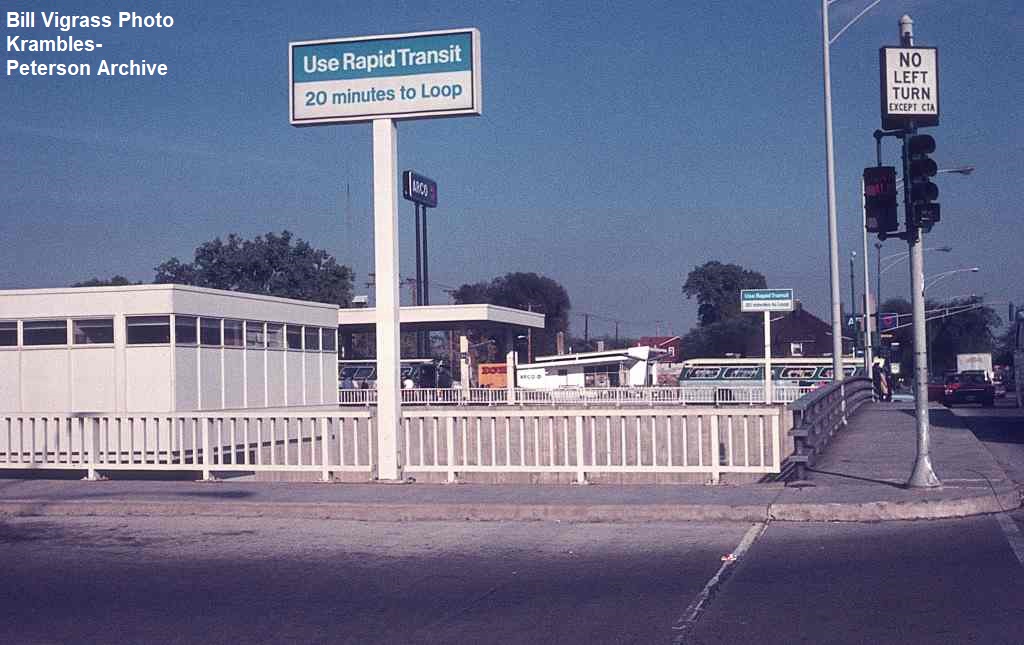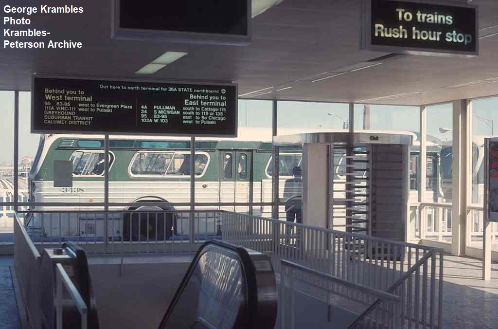 KP1791-CTA Lake-Dan Ryan, Looking north out of the mezzanine at a 3400-series bus sitting on the bus bridge - 09/28/1969