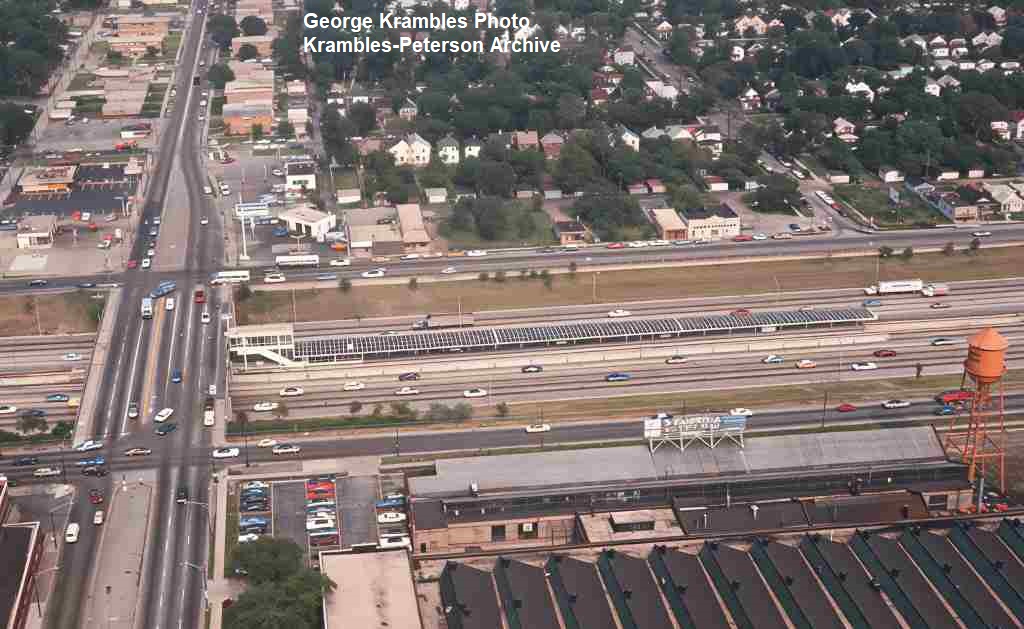 KP1756-CTA Lake-Dan Ryan, Aerial view looking east over the 63rd Street Station. Also in view is an Englewood train in the lower portion of the photo and the Englewood RI-PC Station toward the upper right - 09/17/1969