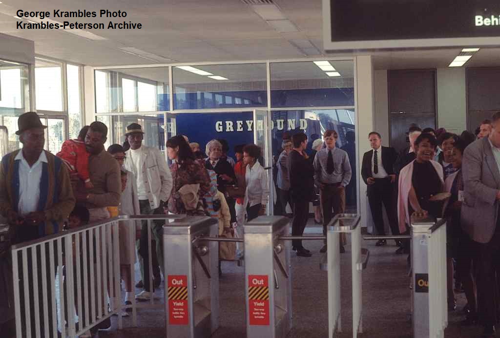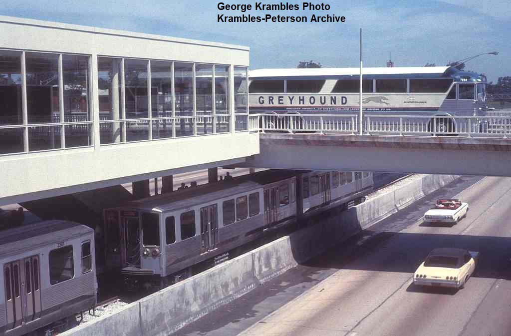 KP1785-CTA Lake-Dan Ryan, Greyhound #7068 on the bus bridge above the #2201 & #2204 in the 95th Street Terminal platform during the IRT convention demonstration runs - 06/27/1969